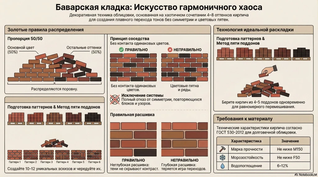 Баварская кладка строится по правилам: кирпичи одного цвета не соприкасаются ни по одной оси, рисунок не содержит симметрии, а базовый оттенок занимает около 50% площади. Обычная пестрота — случайный результат смешения остатков.