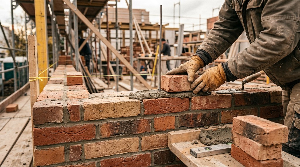 Опытные каменщики заранее раскладывают кирпичи разных оттенков на строительных лесах согласно подготовленным паттернам. Это ускоряет работу и снижает риск ошибок при цветовом распределении.