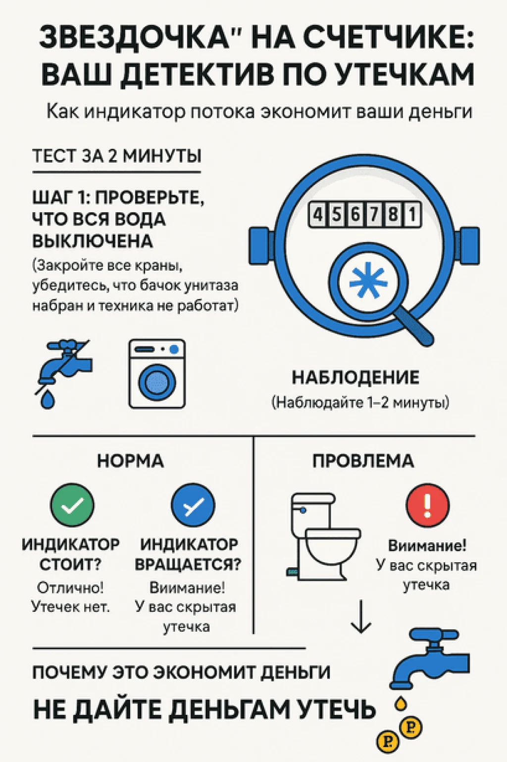 «Вращающаяся 'звездочка' при закрытых кранах — это 100% сигнал об утечке. Чаще всего 'виноват' бачок унитаза», — отмечает сотрудник управляющей компании.