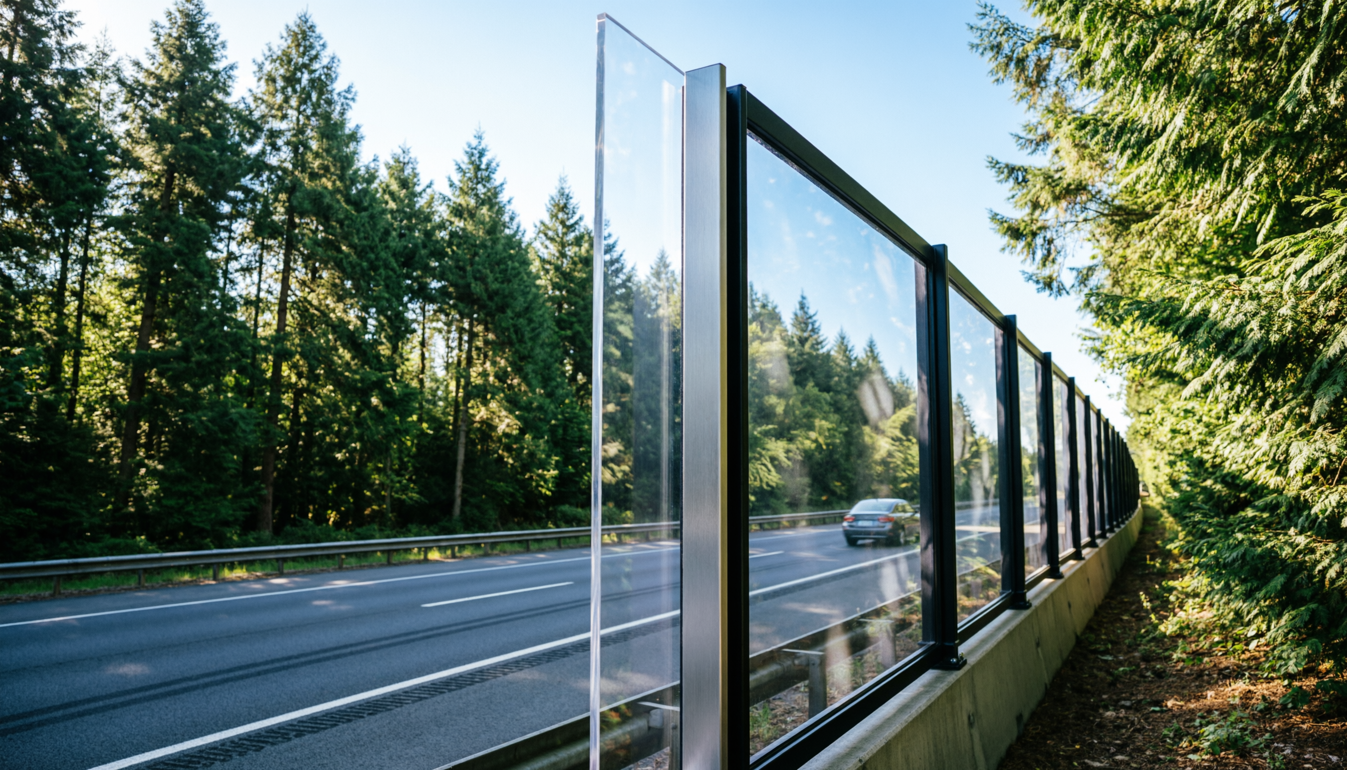 Прозрачные экраны из поликарбоната или акрила незаменимы на участках, где важно сохранить визуальный контакт с окружающей средой или обзор для водителей. Они часто устанавливаются на эстакадах и мостах. Акриловое стекло обладает высокой прозрачностью и устойчивостью к ультрафиолету, не желтея со временем. Такие шумозащитные экраны часто комбинируют с металлическими секциями: нижняя часть делается глухой и поглощающей, так как основной источник шума (колеса и двигатель) находится внизу, а верхняя часть делается прозрачной для снижения визуального давления на водителей.