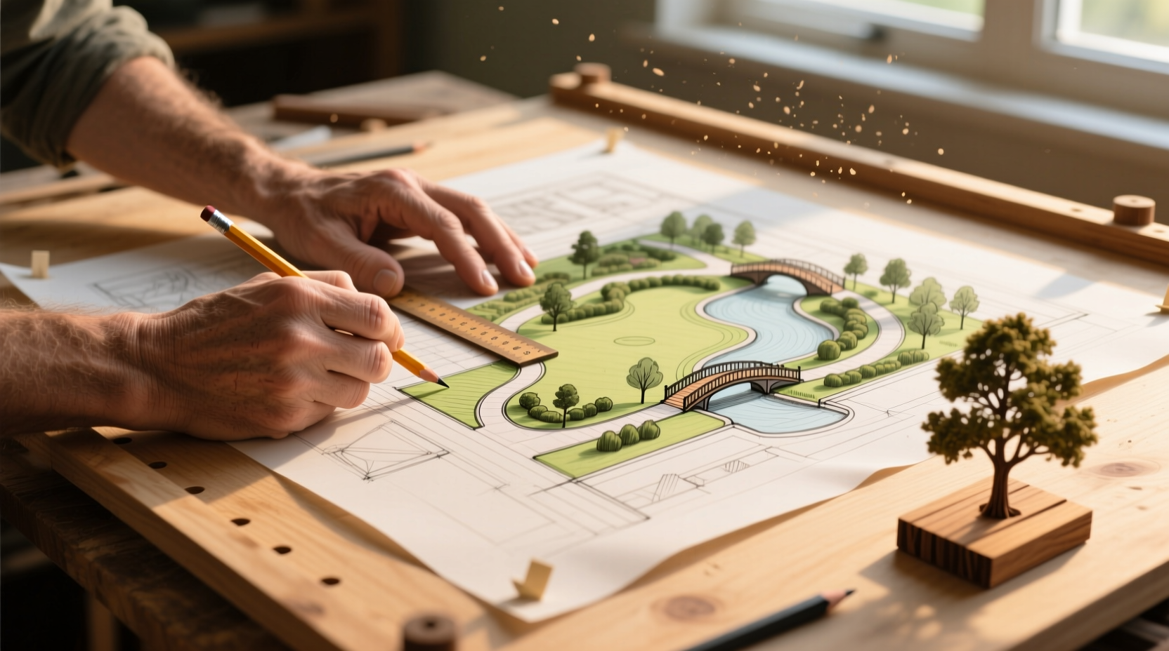 На стадии концепции формируется основная «история» парка. Это может быть сказочная аллея, исследовательская тропа, зона, вдохновлённая местной историей или даже абстрактное пространство, построенное вокруг света, тени и воды. Важно, чтобы каждая зона имела чёткое функциональное назначение, но при этом не нарушала целостности композиции.