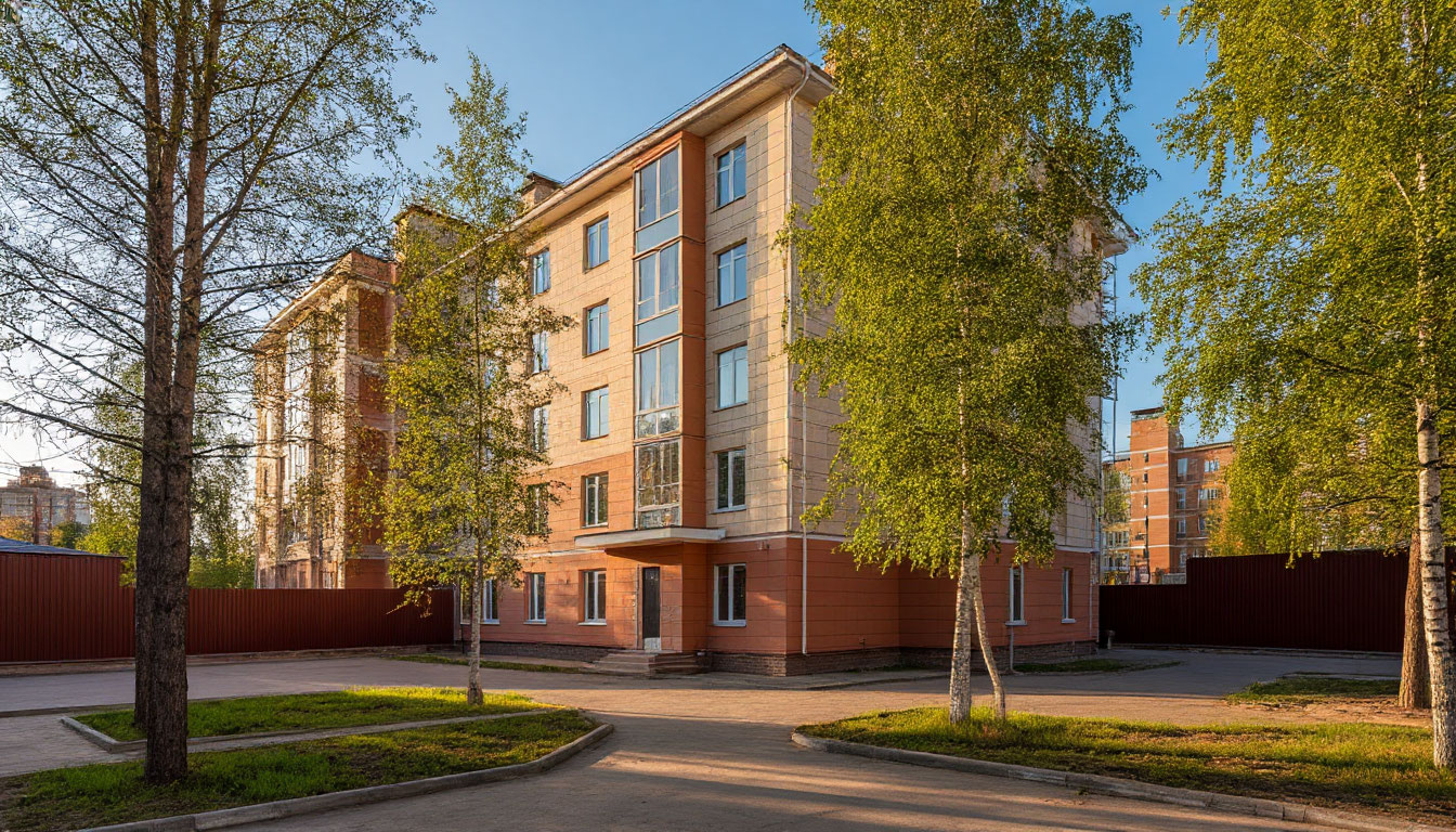 Промт: Modern residential building in Severny microdistrict of Chita, clean facade, young trees in courtyard, morning light, no people or text visible.