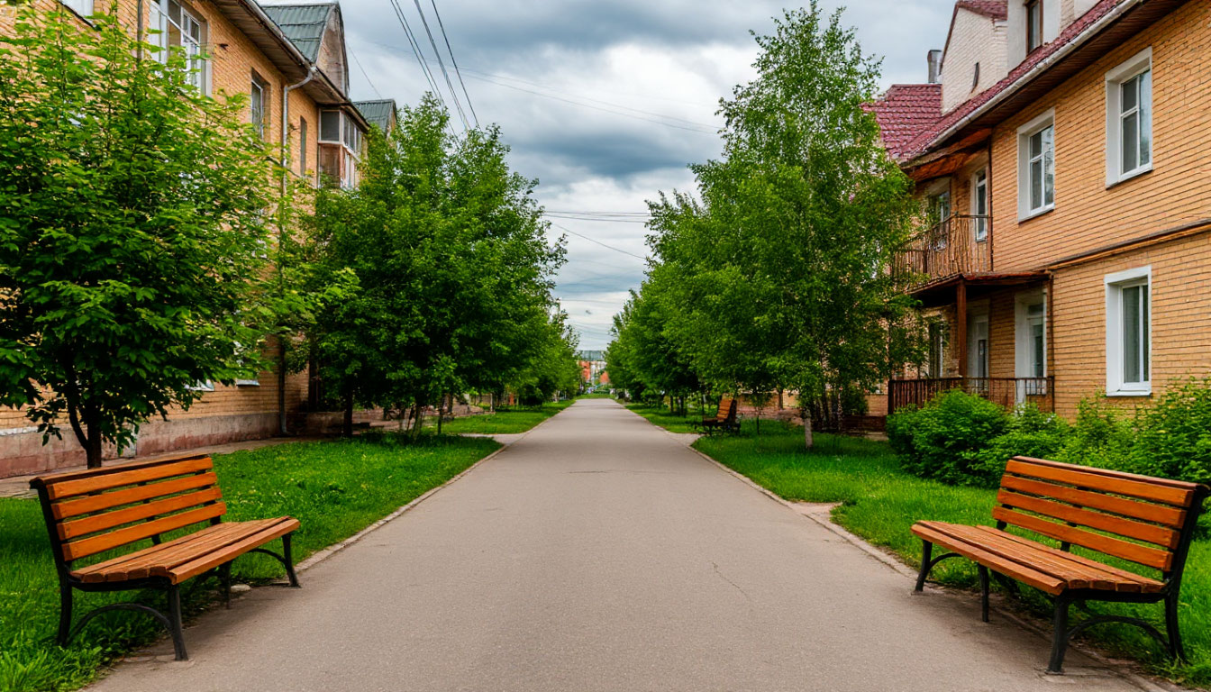 Промт: Quiet residential street in Zarechny area of Chita, low-rise buildings, greenery, wooden benches, overcast but bright daylight, no signage or text.