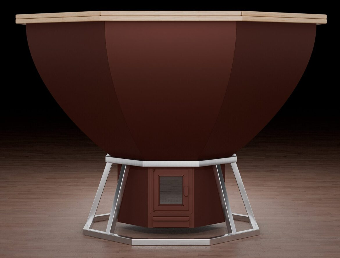 Внешняя дровяная печь. Располагается рядом с чаном и соединяется с ним патрубками. Этот вариант безопасен, так как нет прямого контакта с горячими элементами внутри купели, и освобождает дополнительное пространство в чаше.