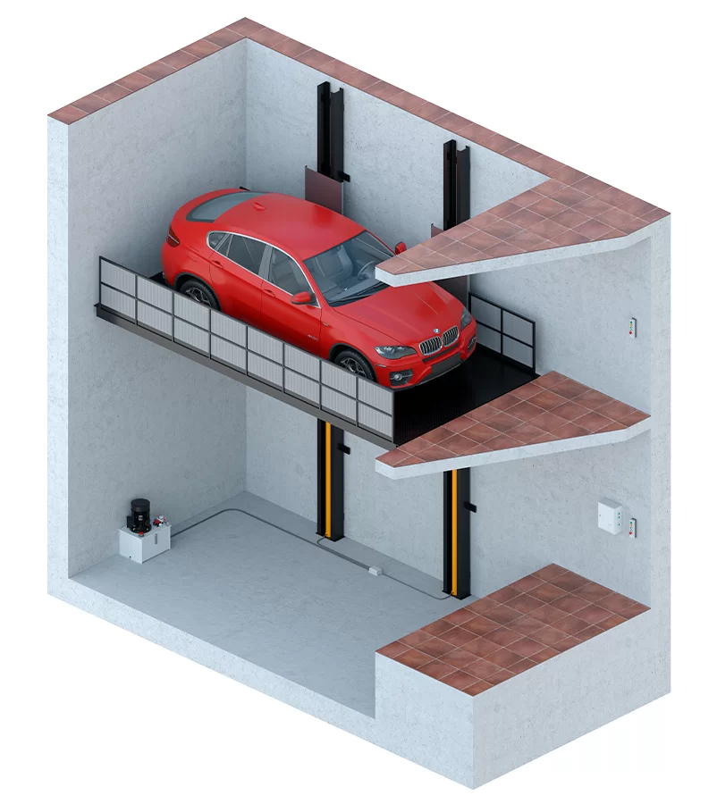 Основным элементом оборудования является грузовая кабина, закрепленная консольно на вертикальных направляющих мачтах, примыкающих к несущей стене. Движение кабины обеспечивает гидравлический или электрический привод. Дверной проем закрывается раздвижными дверьми. Для удобного въезда-выезда автомобиля двери могут располагаться с двух противоположных сторон (в проходных кабинах).