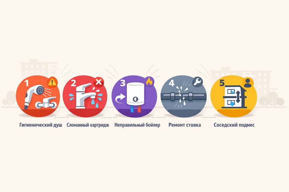 Реальная история: Мария из Москвы заметила странное явление — каждый вечер с 18:00 до 22:00 из горячего крана начинала течь холодная вода, а счетчик ГВС крутился назад. После звонка в УК мастера провели обход по стояку и выяснили: сосед сверху установил гигиенический душ в туалете, но по привычке закрывал только кнопку на лейке, оставляя открытым настенный смеситель. Именно в вечернее время (после работы) он активно пользовался душем. УК обязала соседа установить обратный клапан и правильно закрывать воду. Проблема решилась за неделю.
