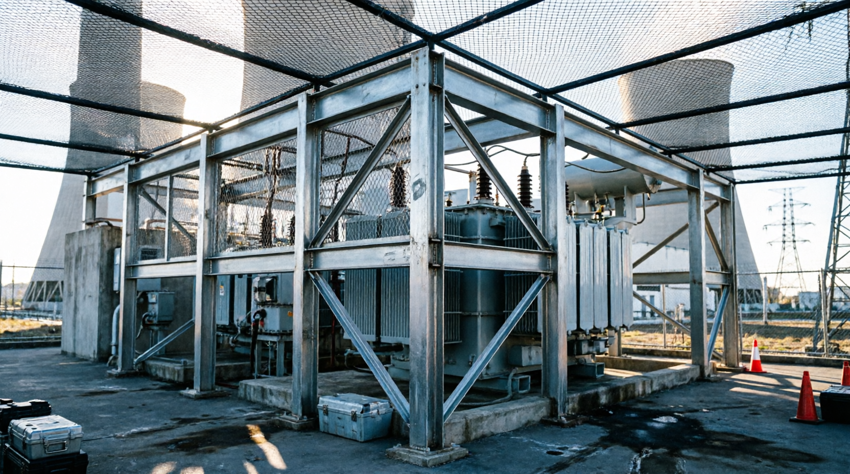 Каркасные конструкции из профильной трубы или уголка создают жесткий пространственный барьер вокруг защищаемого оборудования. Расстояние между элементами каркаса обычно составляет 100-150 миллиметров, что достаточно для предотвращения проникновения дрона, но не препятствует нормальной эксплуатации оборудования и его охлаждению.