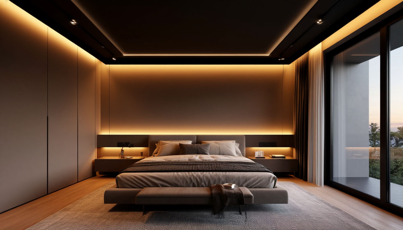 Периметральная подсветка усиливает эффект парения. Светодиодная лента, установленная в специальном профиле, создаёт мягкое рассеянное освещение. Это решение особенно популярно в спальнях и гостиных, где важно создать уютную атмосферу.