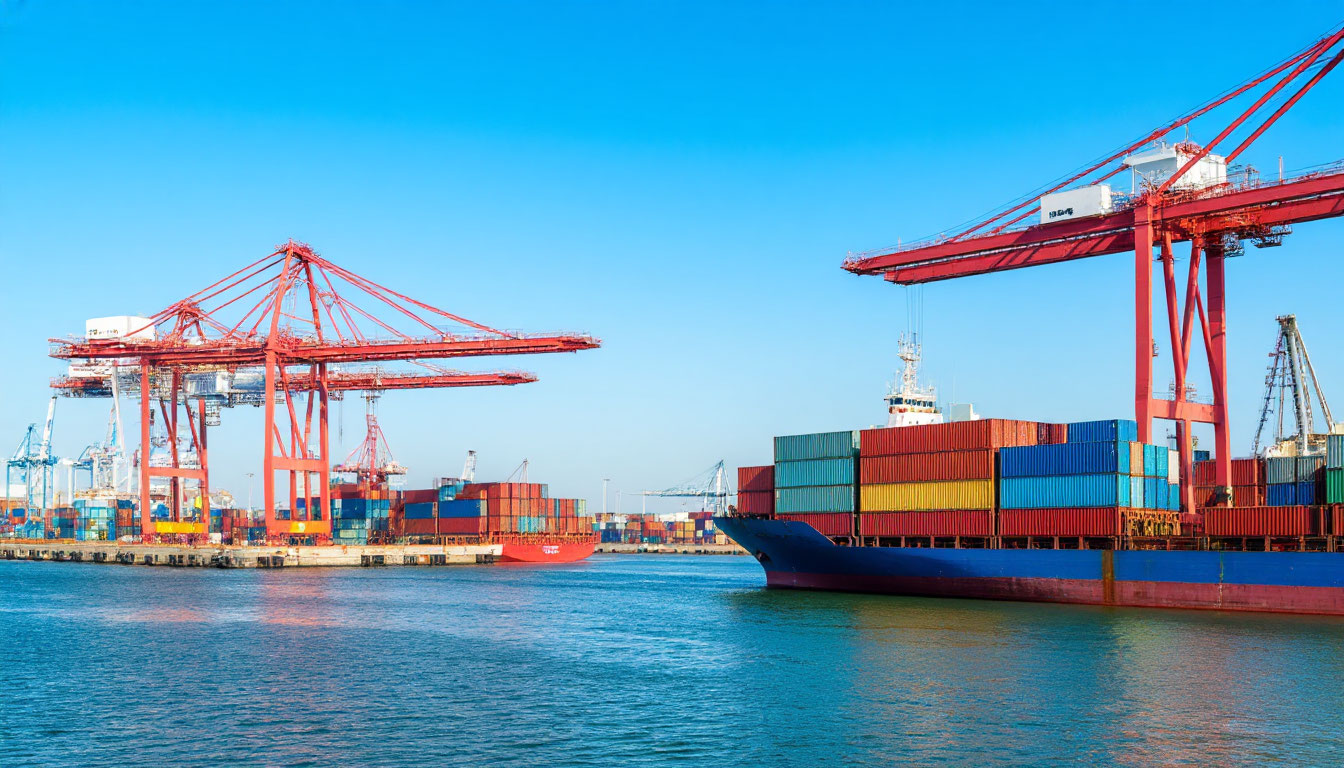 Изображение 2 Prompt: A wide shot of a busy shipping port with large container cranes loading colorful shipping containers onto a cargo ship. The sky is clear and blue. No text or flags visible on the containers. The water is calm. Industrial logistics concept, sharp focus, realistic lighting. Alt: Контейнеровоз в порту во время погрузочных работ