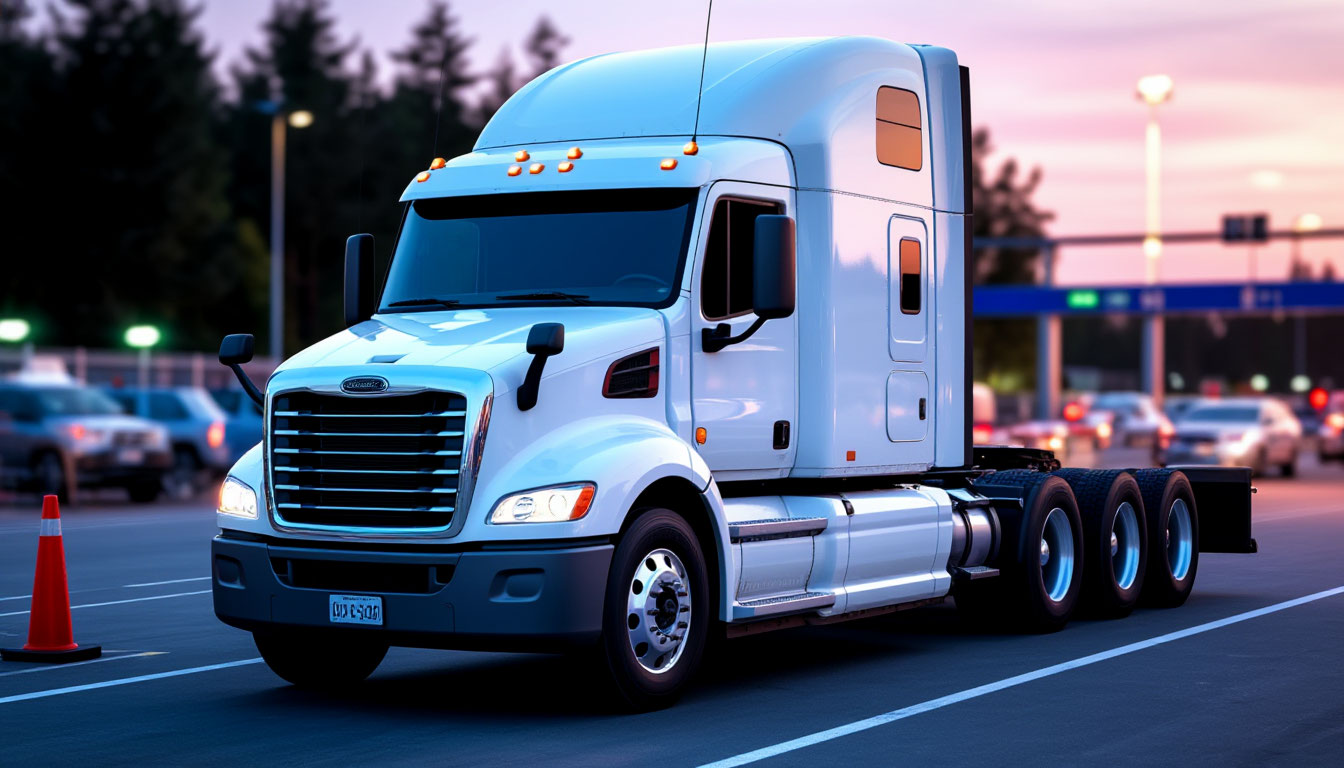 Изображение 1 Prompt: A realistic photo of a modern white semi-truck parked at a customs checkpoint booth during twilight. The truck has no visible logos or text on the trailer. In the background, there are blurred lights of other vehicles and a barrier gate. The atmosphere is professional and slightly industrial. High resolution, photorealistic, 8k. Alt: Грузовой автомобиль на таможенном пункте пропуска в вечернее время