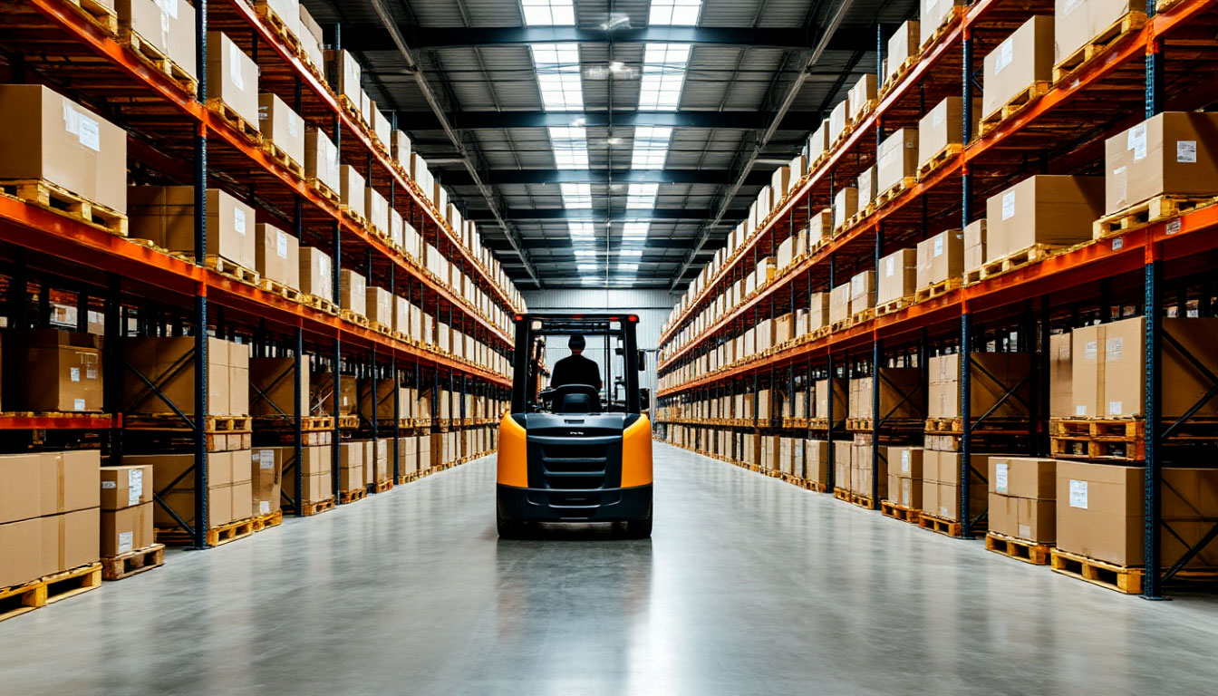 Изображение 3 Prompt: Interior view of a large modern warehouse with high ceilings. Forklifts are moving pallets with goods. The floor is clean concrete. Rows of metal shelving units filled with cardboard boxes. Bright artificial lighting. No people faces visible, no text on boxes. Logistics and storage concept. Alt: Внутреннее пространство современного логистического склада с погрузчиками