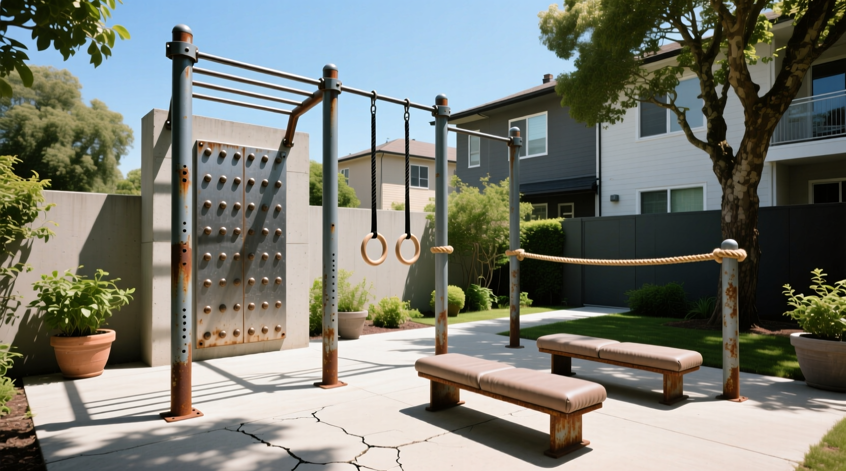 Детализированный кадр элементов воркаут-комплекса: гимнастические кольца, рукоход и канат для лазания, расположенные на металлической раме. Фокус на текстуре покрытия и прочности соединений. Нейтральный фон, дневной свет, без людей, без текста, без брендинга. Минималистичная композиция.