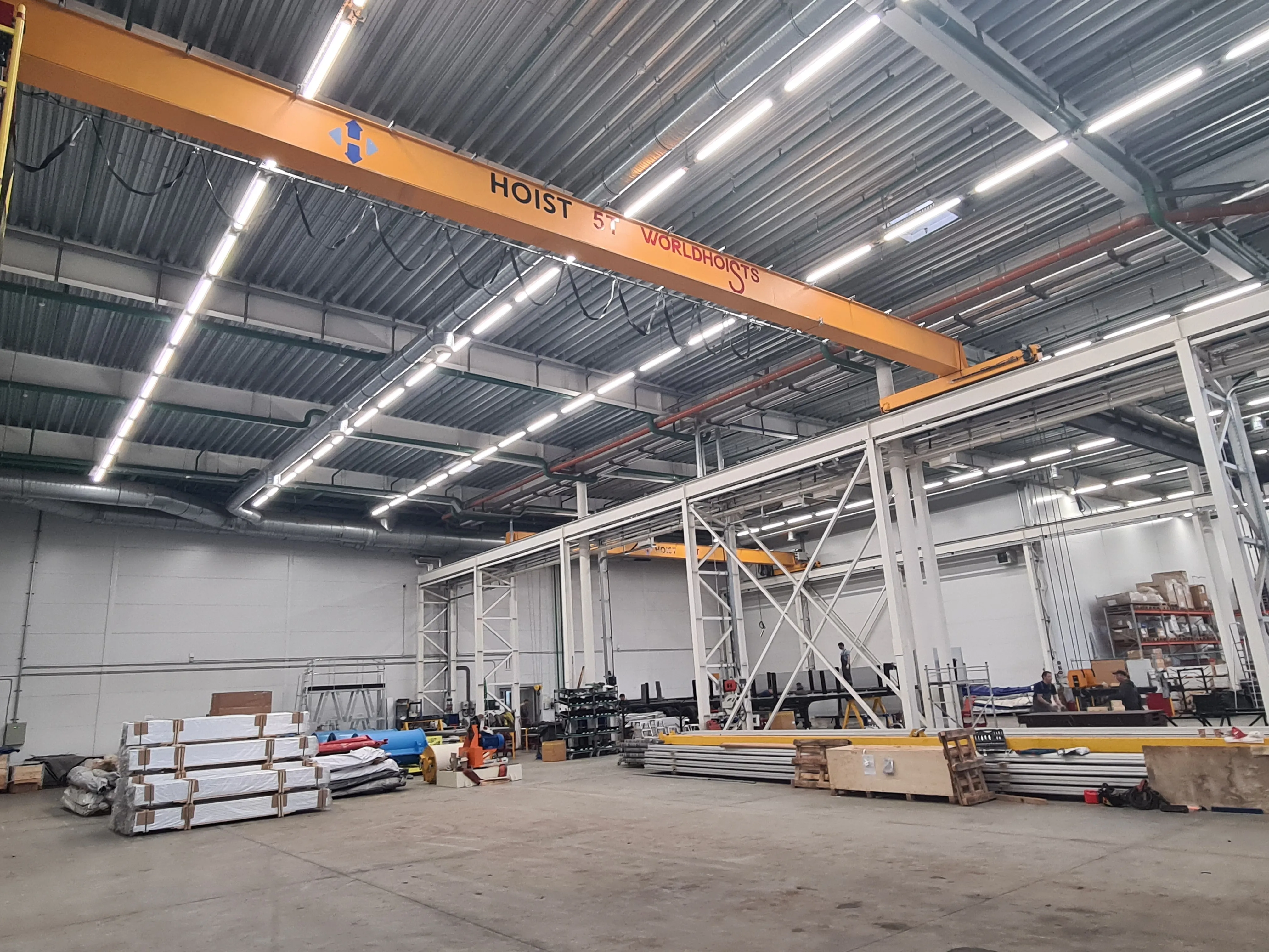 Преимущества: Возможность покрыть всю площадь цеха без «мертвых зон» у стен, не требует строительства колонн (экономия пространства), возможность стыковки нескольких кранов и передачи тележки между пролетами.