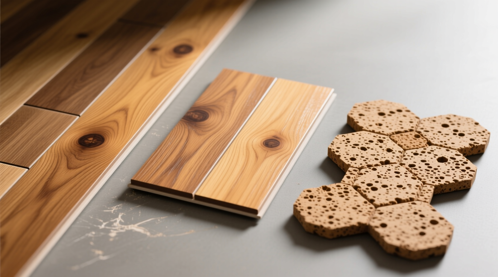 Пробка — один из самых экологичных материалов. Она мягкая, тёплая, обладает естественной звукоизоляцией и приятна на ощупь. Покрытия из пробки бывают двух видов: клеевые (с шпоном натуральной пробки) и замковые (с HDF-основой и пробковым верхним слоем).