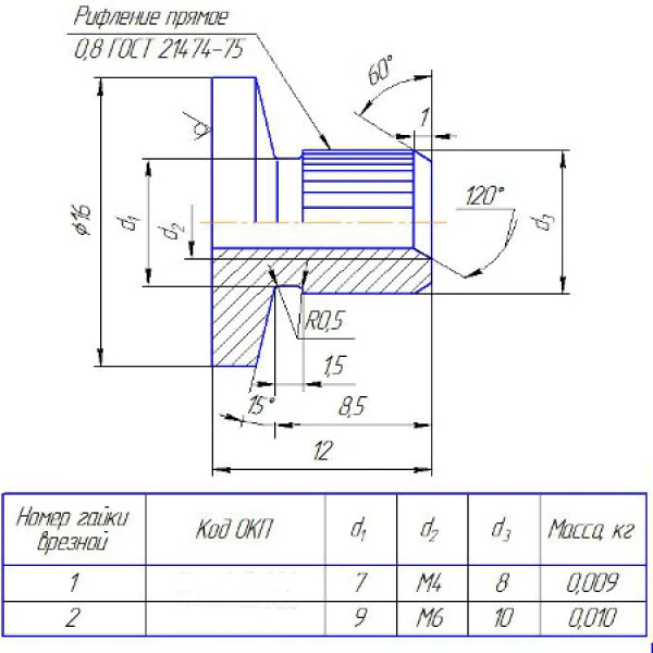 Поставим врезную гайку с прямым рифлением ГОСТ 16561-76 номер 1 и номер 2 диаметрами М4 и М6. Гайка изготавливается из сортовой низколегированной и углеродистой стали обыкновенного качества марки Ст.3 или из углеродистой качественной конструкционной стали марки Ст.10, Ст.20. Данная гайка применяется для деревянных ящиков.