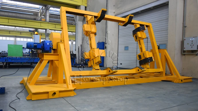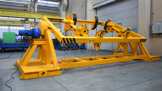 Кантование выполняется на 180 градусов с промежуточным шагом 90 градусов, одна из переворотных кареток является подвижной и в горизонтальном положении, что позволяет осуществлять подгонку по высоте железобетонного изделия. Железобетонное изделие надежно фиксируется специальными боковыми ограничительными элементами.