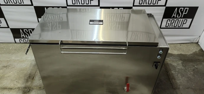 Машина для мойки коптильных вешал (палок) ASP-MMKP предназначена для автоматической мойки стандартных вешал (палок) для копчения, загрязненных при термической обработке мясных изделий. Напольная конструкция с верхней загрузкой. Интенсивная мойка инструмента в подогретом до 60°С моющем растворе происходит во вращающемся барабане. Время мойки регулируется в зависимости от степени загрязнения. Наполнение и слив воды в процессе мойки осуществляется автоматически, через трубки, с помощью контроллера, установленного в электрическом блоке. Дозировка моющего средства осуществляется в ручную. После обработки вешал с моющим средством, происходит процесс ополаскивания. По окончанию процесса звучит звуковой сигнал.