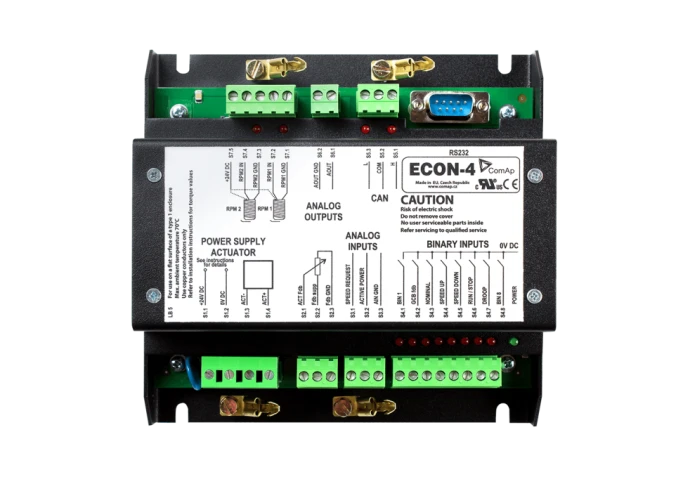 Модуль ComAP ECON-4 цифровой регулятор скорости, предназначенный для управления скоростью газовых или дизельных двигателей. ECON-4 может управлять различными типами приводов (линейные, мостовые, низковольтные), обеспечивая непрерывный сигнал до 8 А, что делает его универсальным регулятором скорости. ECON-4 может быть подключен к системе управления генераторной установкой через CAN-шину.