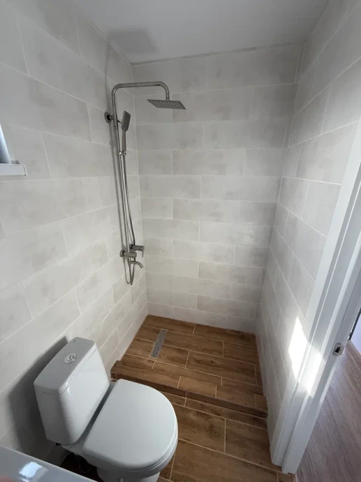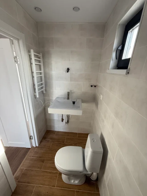• Санузел: Плитка Cersanit Lasvik + теплый пол. Вся сантехника (унитаз Sanita Luxe, раковина, полотенцесушитель) — установлены.