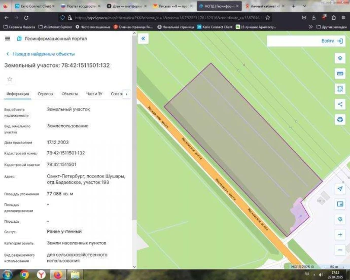 Предлагаем к срочной продаже земельный участок площадью 7,7 га (77 088 кв. м) в поселке Шушары — одном из самых перспективных и активно развивающихся районов Санкт-Петербурга. Крупный массив земли в черте города с отличной транспортной доступностью — предложение, которое редко появляется на рынке.