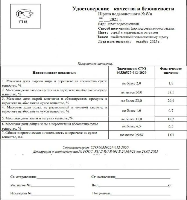 Шрот подсолнечный с протеином 37-38 на АСВ. Форма — ракушка. Так же есть гранула.
