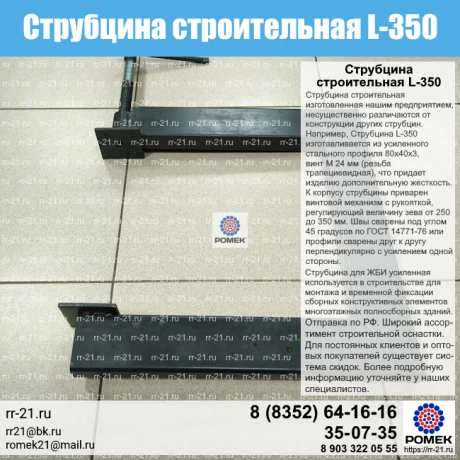 Струбцина строительная изготовленная нашим предприятием, несущественно различаются от конструкции других струбцин. Например, Струбцина L-350 изготавливается из усиленного стального профиля 80х40х3, винт М 24 мм (резьба трапециевидная), что придает изделию дополнительную жесткость. К корпусу струбцины приварен винтовой механизм с рукояткой, регулирующий величину зева от 250 до 350 мм. Швы сварены под углом 45 градусов по ГОСТ 14771-76 или профили сварены друг к другу перпендикулярно с усилением одной стороны.