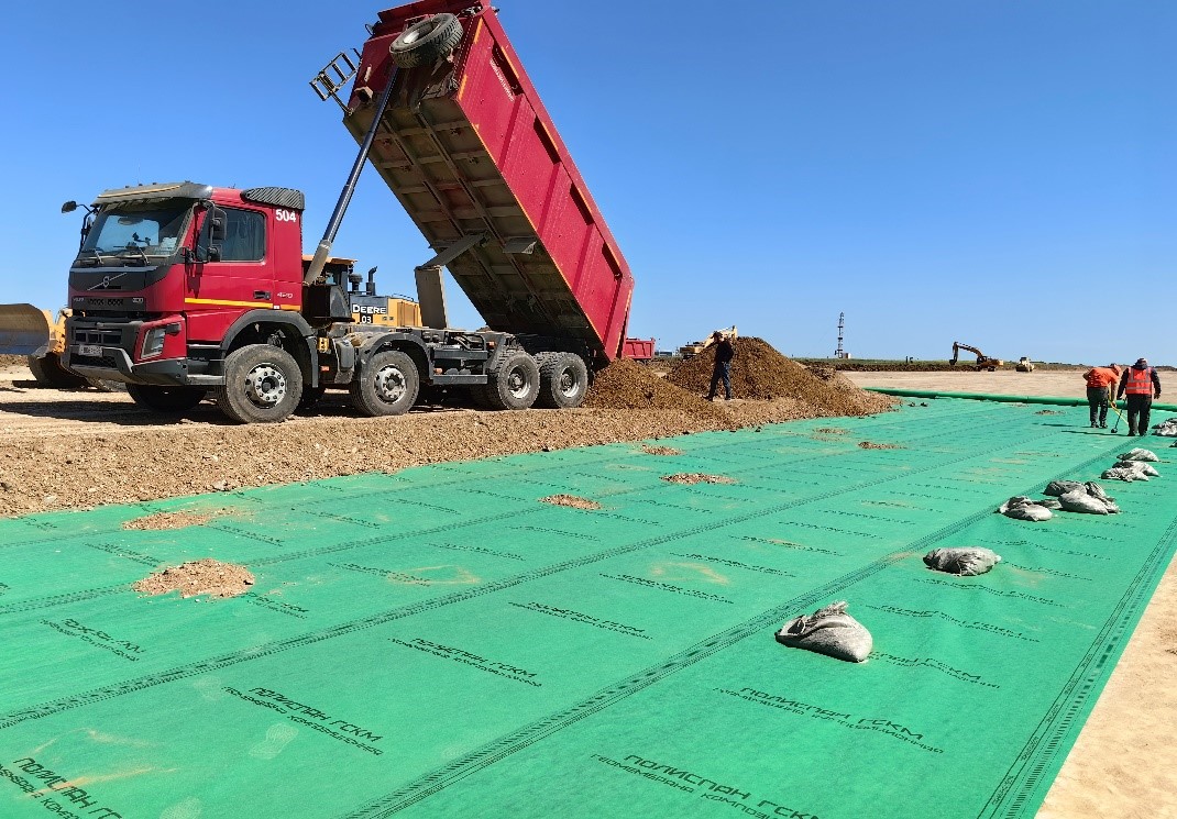 Композитная геомембрана для дорожного строительства Полиспан ГСКМ, шириной полотна 3,2 метра. Благодаря инновационному подбору полимеров и технологии производства новый материал Полиспан ГСКМ позволяет комплексно решать четыре задачи – это гидроизоляция, армирование, разделение и регулирование водно-теплового режима. Таким образом, Полиспан ГСКМ может заменить сразу три материала – геосетку, геотекстиль и обычную геомембрану.