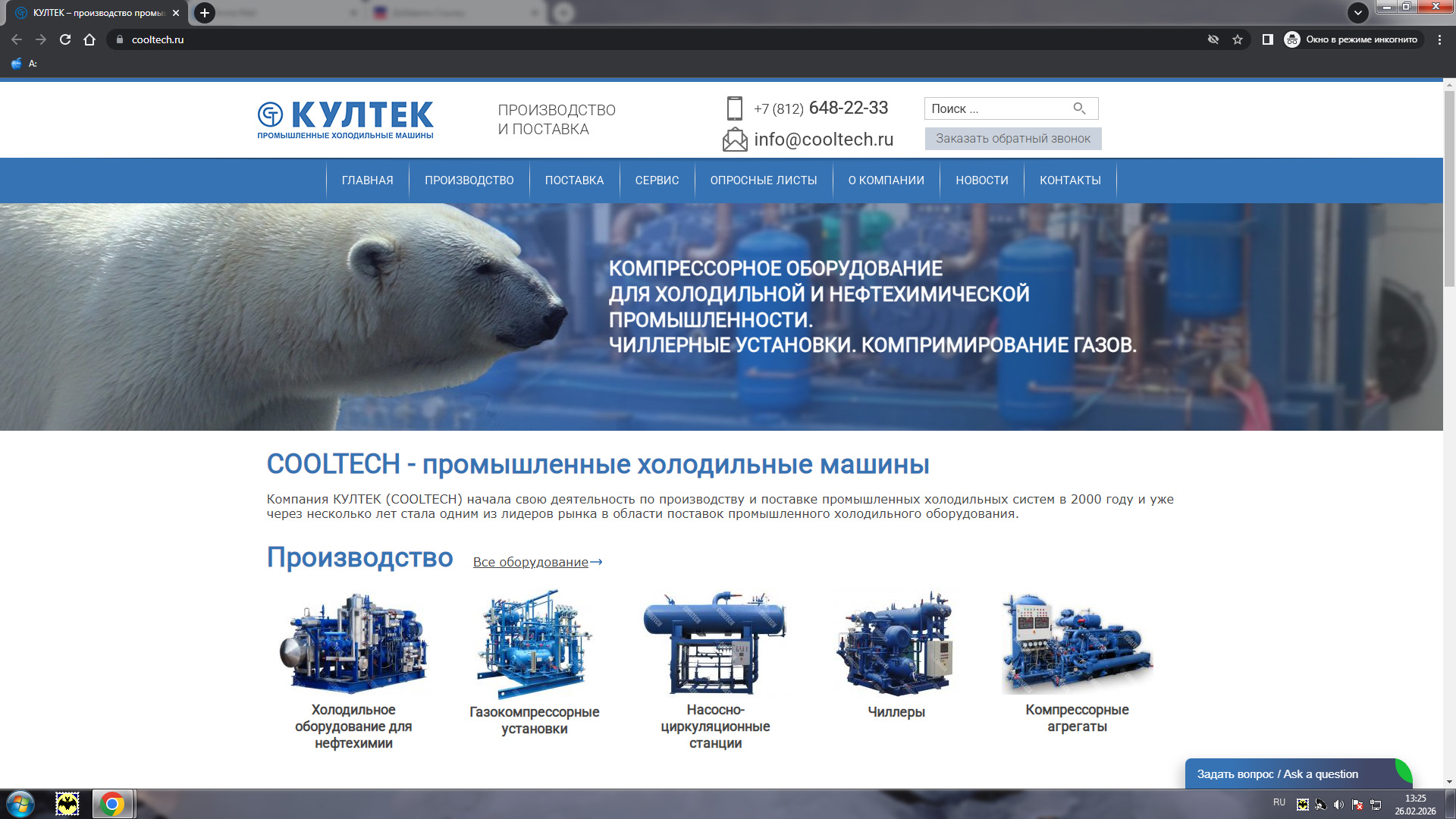 Производство промышленных газокомпрессорных установок, компрессорных агрегатов, чиллеров, насосно-циркуляционных станций, холодильных систем любой сложности, холодильных и морозильных комплексов.