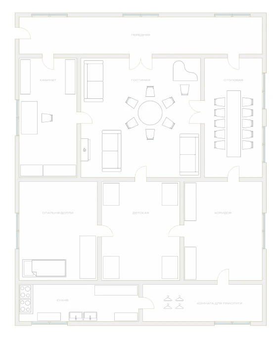 Лев Толстой тоже не обошел вниманием дома, квартиры и гостиные, которые упоминаются в романе. А планировку удалось создать благодаря вот этой цитате: «Квартира Облонских занимала весь второй этаж большого дома. В центре была большая гостиная с мягкой мебелью и камином, из которой двери вели в столовую, кабинет Стивы и детскую. Спальня Долли находилась рядом с детской. Кухня и комнаты для прислуги располагались в задней части квартиры, а из передней можно было выйти на парадную лестницу…».