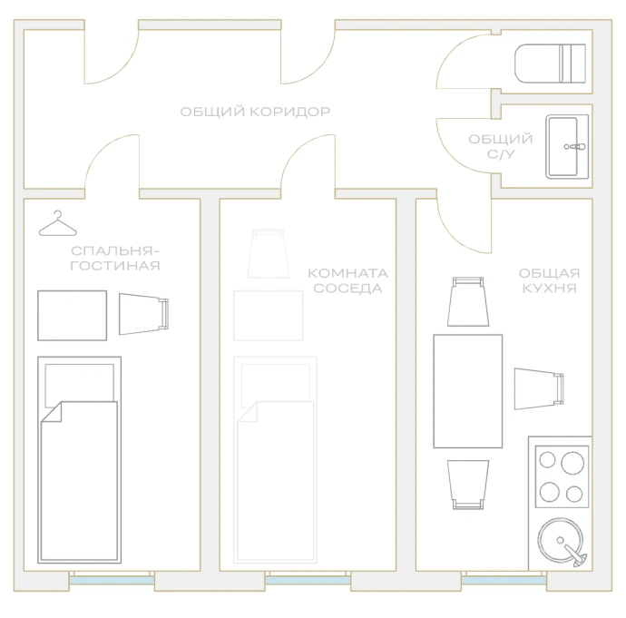 «Комната Остапа Бендера в коммунальной квартире была узкая, с одним окном на двор. В ней стояли кровать, столик, стул и вешалка. Из комнаты дверь вела в коридор, где была общая кухня с плитой и раковиной, а дальше — ванная и уборная».