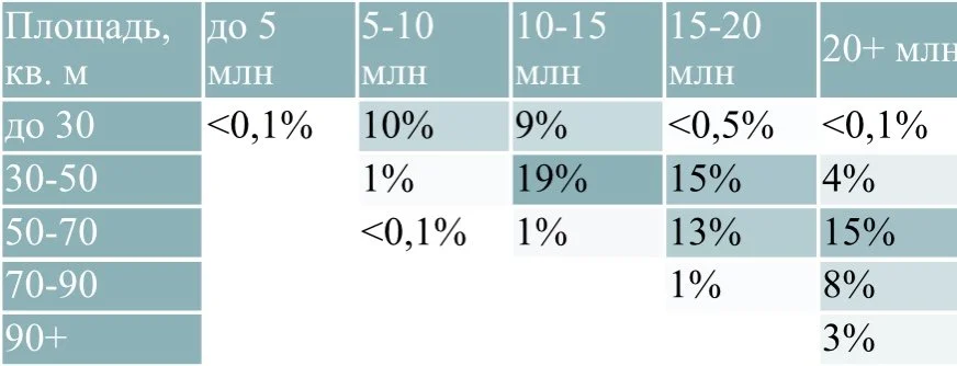 В высокобюджетном сегменте (элит- и делюкс-класс) превалируют лоты площадью 150-200 кв. метров стоимостью свыше 300 млн рублей (15% от общего объема предложения).