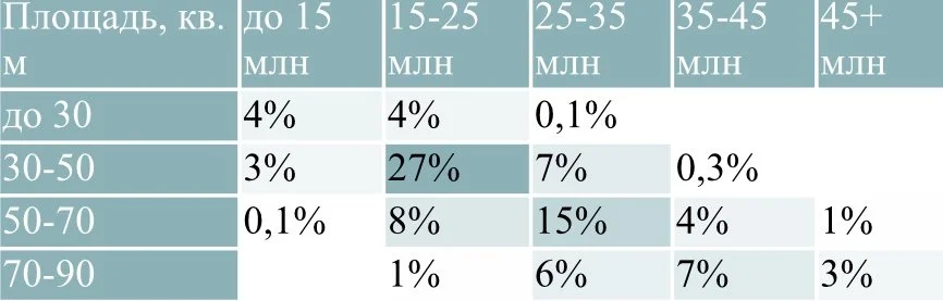 Соотношение предложений на первичном рынке недвижимости массового сегмента в зависимости от стоимости и площади