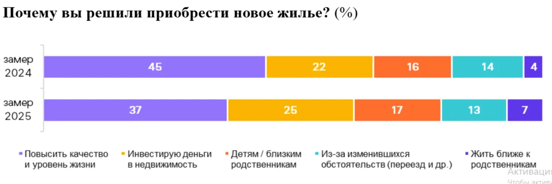 На втором месте среди причин покупки жилья — инвестиционные цели. Каждая четвертая покупка совершается с расчетом на рост стоимости объекта или сдачу в аренду. Доля инвестиционных покупок за год выросла на 4 п. п и достигла 25%. Аналитики связывают это с повышением доверия населения к недвижимости как инвестиции.