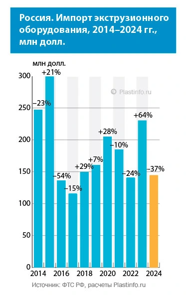 В денежном выражении инвестиции в экструзионное оборудование в 2024 году упали на 37,1% и составили 144 млн долл. (13,3 млрд руб. по среднему курсу 92,4 руб./долл.) без налогов и пошлин. При этом в общем объеме импорта оборудования для переработки пластмасс и каучука доля инвестиций в экструзионный сегмент снизилась с 30 до 27%.