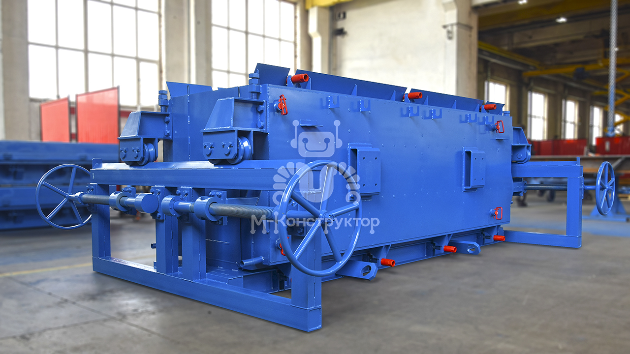 Состоит из центрального формирующего модуля (двусторонняя ступенчатая поверхность) и двух подвижных продольных формообразующих бортов. Все элементы смонтированы на жёсткую силовую раму, включая механический механизм распалубки. При распалубке важно соблюдать синхронность вращения колес во избежание перекоса.