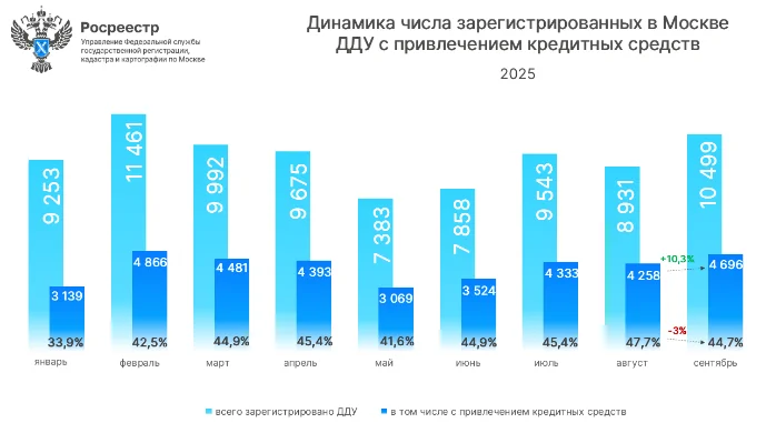В сентябре 2025 года Управлением Росреестра по Москве зарегистрировано 4 696 договоров участия в долевом строительстве в отношении жилой и нежилой недвижимости с привлечением кредитных средств. При этом доля ипотечных сделок от общего числа оформленных в сентябре ДДУ составила 44,7%. Об этом сообщил руководитель Управления Росреестра по Москве Игорь Майданов.