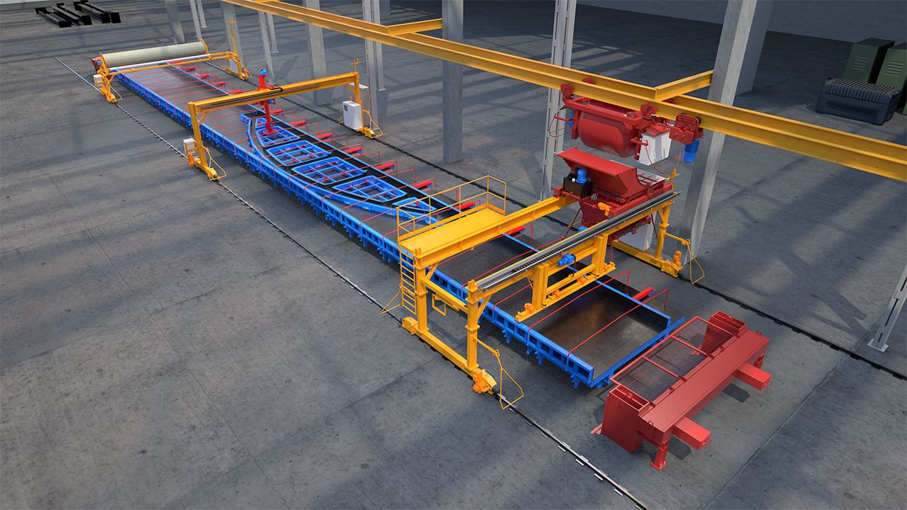 Вместе с адресной подачей бетона в эксплуатацию будет запущен целый формовочный комплекс: линия с упорами для натяжения арматуры, бетоноукладчик с виброрейкой, магнитная бортоснастка, размотчик укрывного полотна, заглаживатель бетона.