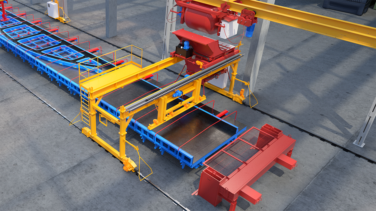 Портальный бетоноукладчик предназначен для равномерной подачи и распределения бетонной смеси по рабочей зоне формующей линии длиной 40 м. Его конструкция состоит из трёх основных компонентов: портала, бункера и площадки обслуживания.