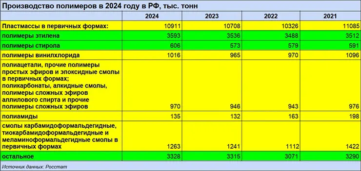 Полимеры пропилена «Росстат» традиционно не отображает, и они в приведенной таблице находятся в группе «Остальное». Они также не дали существенного прироста, и это связано с чисто техническим фактором. Основные производства полипропилена в России работают с двухлетним циклом капремонтов. В год капремонта, то есть когда есть несколько дней полной остановки производства, объемы выпуска традиционно сокращаются. 2024 год был годом капремонтов, что и сказалось на скромных годовых результатах.