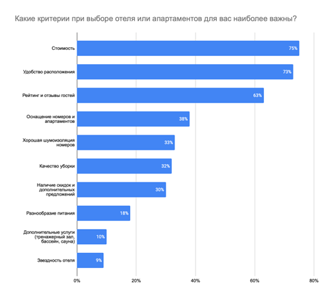 В числе других значимых критериев выбора — стоимость размещения (на это указывают 75% респондентов), удобство расположения отеля (73%), рейтинг объекта и отзывы гостей (63%), оснащение номеров и апартаментов (38%), качество уборки (32%).