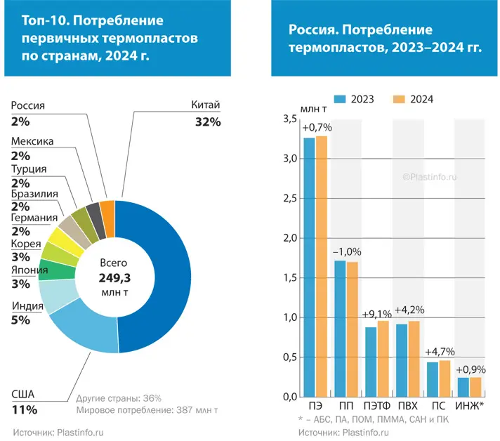 В общемировом рейтинге переработки термопластов Россия с данным результатом заняла 10-е место с долей 2%. Согласно расчетам Plastinfo, на долю топ-10 стран в 2024 году пришлось 249,3 млн т или 64% всей мировой переработки первичных пластмасс, где на первом месте с огромным отрывом — Китай с долей 31,8%, на втором — США с долей 11,2% и на третьем — Индия с 4,8%. Доли остальных стран первой двадцатки находятся в пределах от 1 до 3%.