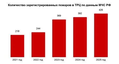 На протяжении последних пяти лет количество пожаров в ТРЦ неуклонно растет, несмотря на то что таких объектов не становится больше. Так, в 2021 году в стране насчитывалось 1 950 торговых центров площадью более 5 тыс. м2, а к концу 2025 года — 2 003, из которых 53 объекта были в стадии строительства. При этом количество зарегистрированных пожаров выросло с 218 до 426 случаев.