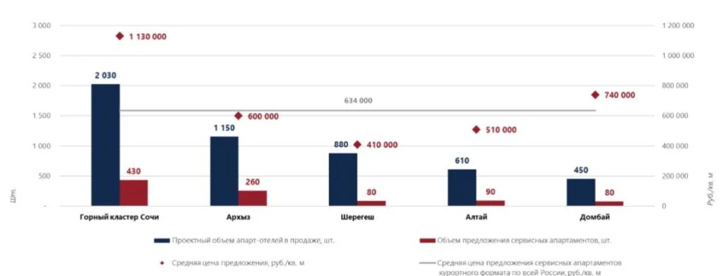 Аналитики отметили, что суммарный проектный объем готовых и строящихся объектов сервисных апартаментов на первичном рынке горного кластера Сочи превышает 2 тыс. лотов, при этом в продаже представлено около 430 лотов. Это наибольшие значения показателей среди всех российских горных кластеров.