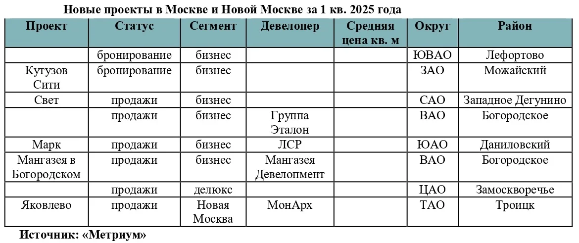 В I квартале 2025 года на рынке новостроек Москвы, включая Новую Москву, стартовали продажи восьми новых проектов, подсчитали аналитики «Метриум». Это минимальный показатель за последние тринадцать лет.