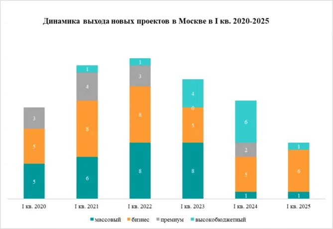 В I квартале 2025 года на рынке новостроек Москвы не появилось ни одного нового проекта апартаментов. Для сравнения: в I квартале 2024 года стартовали продажи трёх проектов апартаментов, в I квартале 2023 и 2022 годов – по 11, в I квартале 2021 года – пяти, а в I квартале 2020 года – восьми.