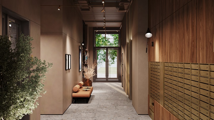В свою очередь оригинальность лобби корпуса D подчеркивает холл, напоминающий галерею современного искусства. Арт-объекты акцентированы торшерами в стиле Баухаус, что превращает пространство в музейную экспозицию. Панели с текстурой под деревянный шпон с латунными почтовыми ящиками напоминают винтажный секретер. Стиль, заданный в лобби, сохраняется на этажах: латунь и дерево используются в отделке входных дверей в квартиры, формируя общий гармоничный образ интерьера.