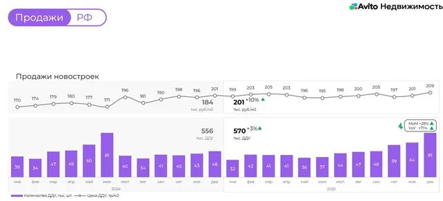 По итогам 2025 года на первичном рынке жилья продажи по договору долевого участья (ДДУ) выросли на 3% год к году, что во многом обусловлено сильными результатами IV квартала — на него пришлось 36% всех сделок. Ажиотаж спровоцировали новости о предстоящих изменениях в семейной ипотеке. Об этом «Службе новостей» сообщили в пресс-службе платформы «Авито Недвижимость».
