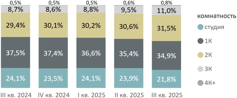 На фоне ограниченного пополнения рынка новостроек массового сегмента Москвы отмечено сокращение доли студий (21,8%, -2,1 п.п. за квартал) и однокомнатных форматов (34,9%, -0,5 п.п.) в структуре предложения как лотов с наиболее быстрым циклом реализации. Такие данные «Службе новостей» предоставили аналитики компании «Метриум», которые уточнили, что в целом объем предложения на первичном рынке массового сегмента Москвы за квартал сократился на 15%.