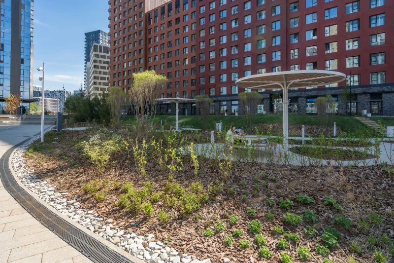Ландшафтная концепция продолжает идею архитектурного сада, в котором растения становятся не просто фоном, а самостоятельной частью городской среды. Посадочный материал подобран с учетом декоративных качеств, устойчивости и сезонного ритма озеленения.