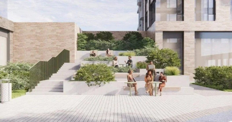 Трехъярусный амфитеатр площадью 300 кв. метров и высотой 1,8 м создает одновременно ограждение приватного двора премиальных башен и рекреационную зону, выходящую на общественный бульвар. Конструкция получит обильное озеленение с акцентом на многолетние и вечнозеленые растения, в двух нижних эксплуатируемых ярусах разместятся модули под сидячие места со столиками. Часть амфитеатра со стороны двора станет игровой интерактивной стеной в составе детской площадки, там также предусмотрены зоны отдыха с шезлонгами.